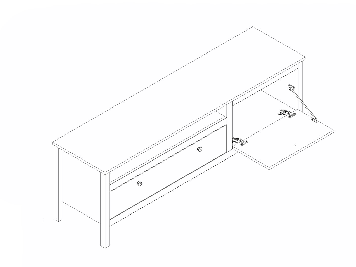- 3 отделения: 1 выдвижной ящик на металлических направляющих, открытое отделение и отделение за распашной глухой дверью;