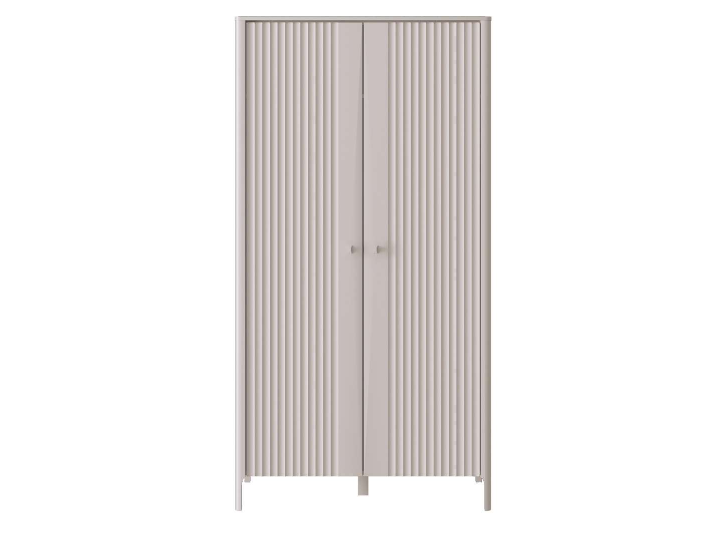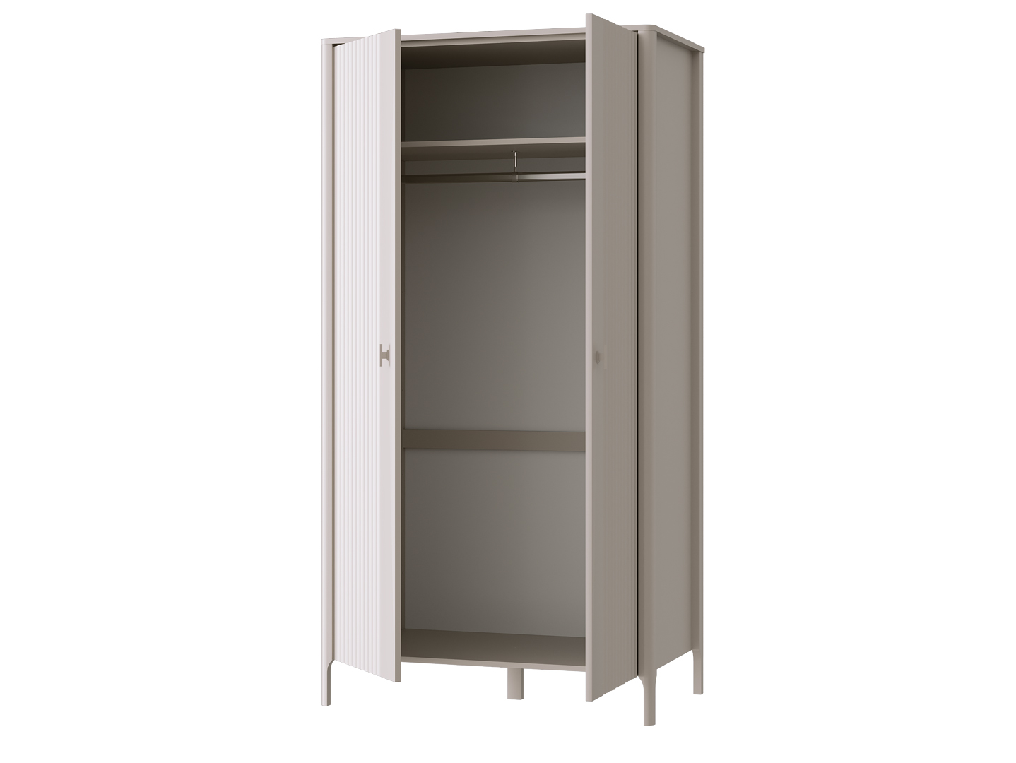- За 2 распашными дверями шкафа из МДФ с рифленой текстурой расположена металлическая штанга для одежды